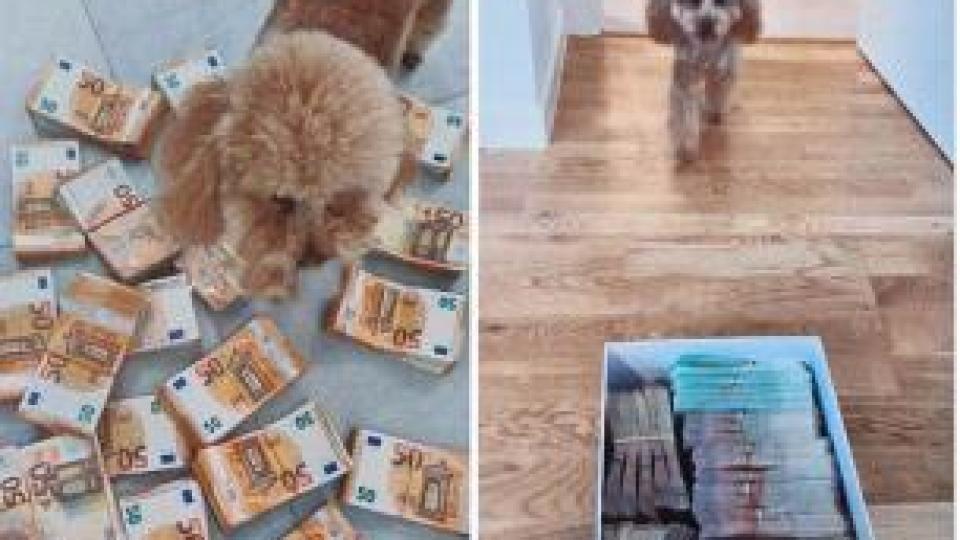Пуделът на Стефан Димитров - Малката Яра, сниман с пачки от цигарената контрабанда в която гърмят имена на политици от ПП-ДБ