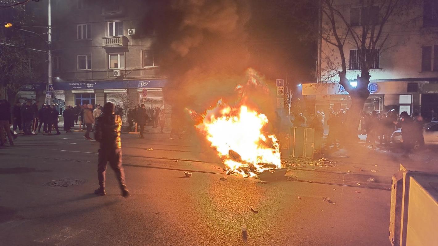 На място пристигнаха и пожарна, и патрулки, а полицаите бяха в пълно бойно снаряжение с щитове пред себе си. Провокатори започнаха да мерят униформените с бутилки, камъни и други предмети. Бутаха запалени контейнери със смет срещу униформените.