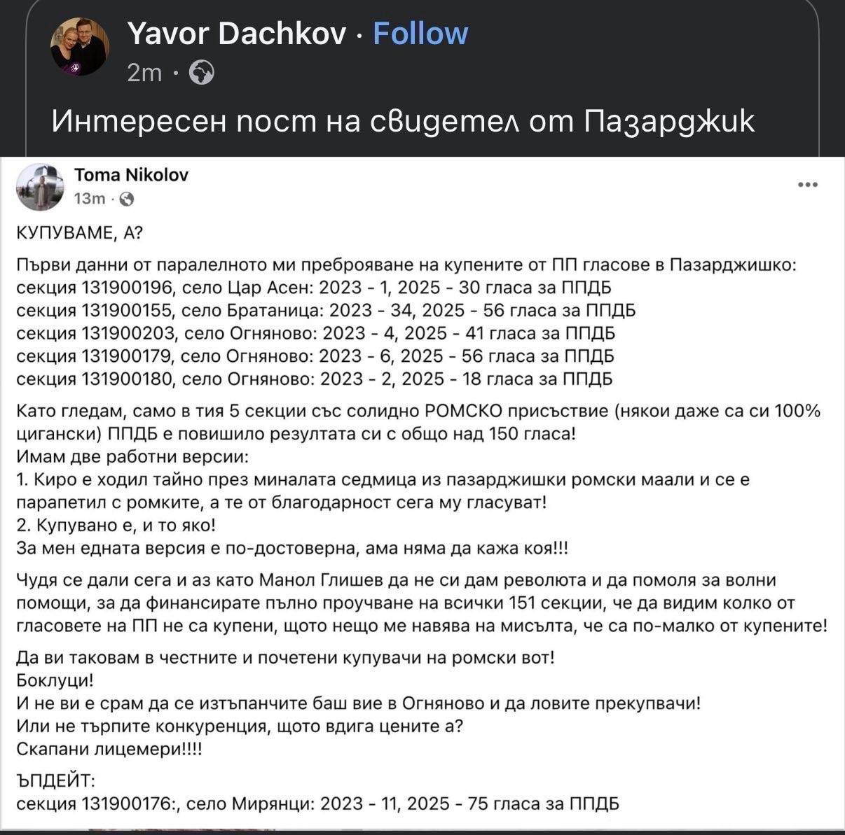 Чудя се дали сега аз като Манол Глишев да не си дам революта и да помоля за волни помощи, за да финансирам пълно проучване на всички 151 секции, че да видим колко от гласовете на ППДБ не са купени, щото нещо ме навява на мисълта, че са по-малко от купените!