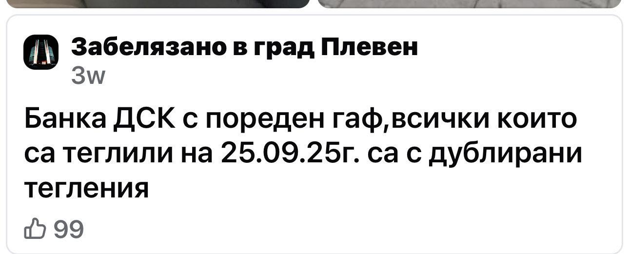 На фона на подобна очеизвадна некадърност и повсеместна шуробаджанащина, логично възникват проблеми, ощетяващи пряко потребителите. Така например от публикации в едноименната неофициална група на ДСК във фейсбук научаваме, че на 25 септември т.г. тегленията от сметките на клиенти са били дублирани. Т.е ако човек изтегли примерно 300 лв. на банкомат, от сметката му “мистериозно” биват дръпнати още 300 лв., които в последствие са отчетени като повторно теглене. Едва след като стотици клиенти реагират на измамата, подавайки жалби и сигнали, от ДСК ги информират, че се касаело за “софтуерен проблем” и надвзетите незаконно и против волята на клиентите пари по сметките ще бъдат възстановени. Най-стряскащо обаче е, че от медийни публикации научаваме, че идентичен проблем е възникнал и на 16.07.2024 г., а от БНБ са коментирали, че платежните институции са длъжни са информират незабавно централната банка при възникване на толкова значим инцидент. Дали виновник е “компютърът” или говорим за целенасочен опит за кражба, искрено се надяваме репресивните органи да проведат адекватно разследване, а БНБ да вземе мерки.