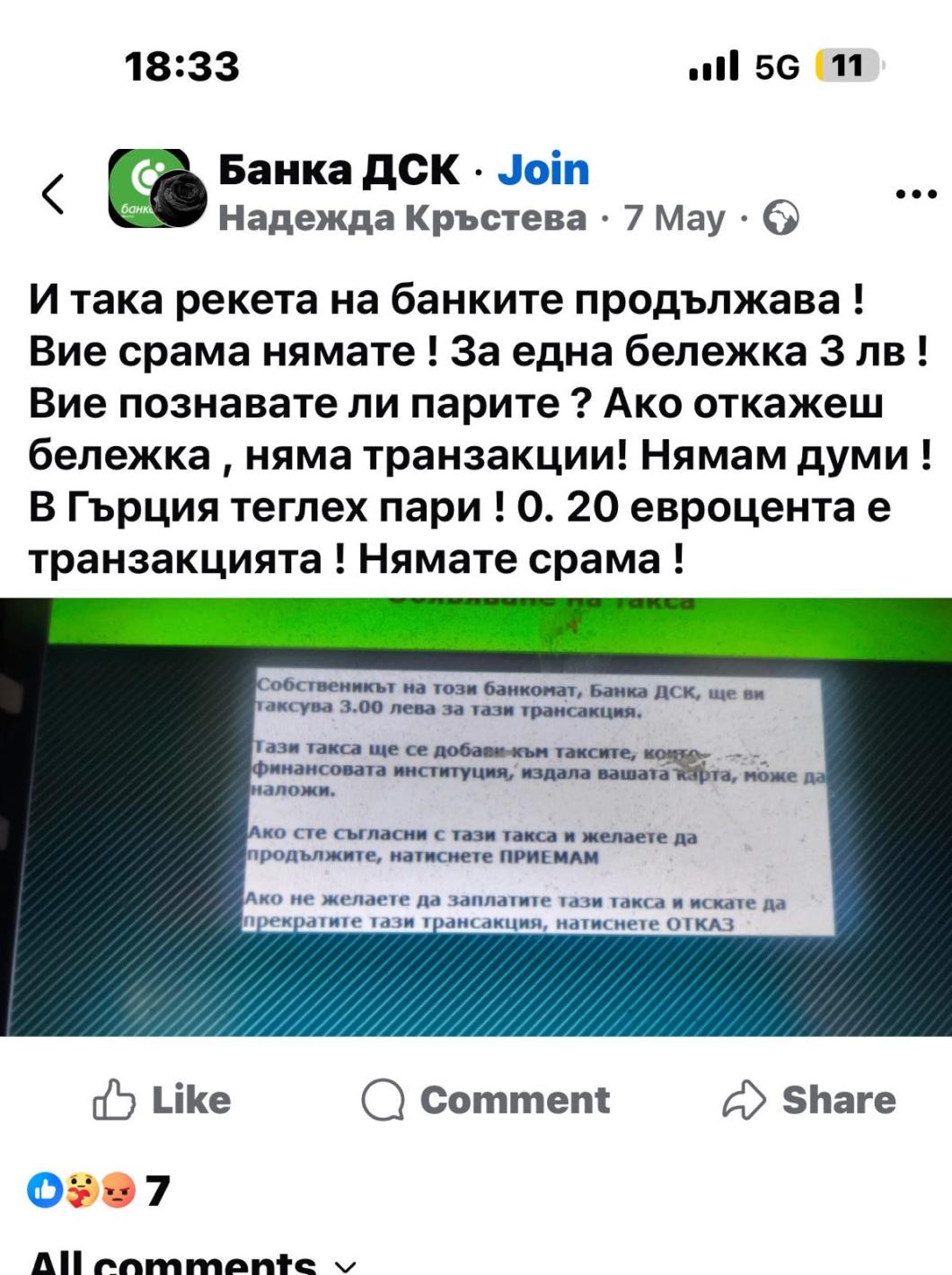 За сметка на това ще оповестим една меко казано неетична, но пък съвсем законна практика, описана от потребител. В публикувана снимка на банкомат виждаме, че ДСК взема по 3 лв. за теглене на пари от тяхно устройство. Без значение каква е сумата, налогът от 3 лв. е задължителен ако човек иска да си вземе част от собствените си пари. За сметка на това, в съседна Гърция същата услуга му е струвала само 0,2 евроцента на трансакция, пише ощавеният клиент.