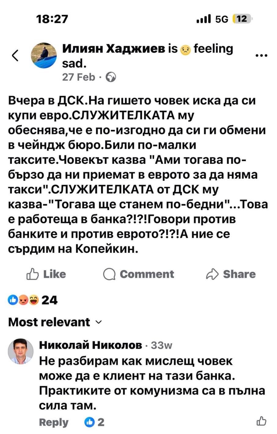 Потвърждение на негативната тенденция обаче срещнахме и в социалните мрежи. В неофициална фейсбук група на потребители на услугите им, наречена “Банка ДСК”, срещнахме следният смущаващ пост от 27 февруари т.г.: “…Вчера в ДСК. На гишето човек иска да си купи евро. СЛУЖИТЕЛКАТА му обяснява, че е по-изгодно да си ги обмени в чейндж бюро. Били по-малки таксите. Човекът казва: „Ами тогава по-бързо да ни приемат в еврото, за да няма такси.“ СЛУЖИТЕЛКАТА от ДСК му казва: „Тогава ще станем по-бедни.“ … Това е работеща в банка?!?! Говори против банките и против еврото?!?! А ние се сърдим на Копейкин….”