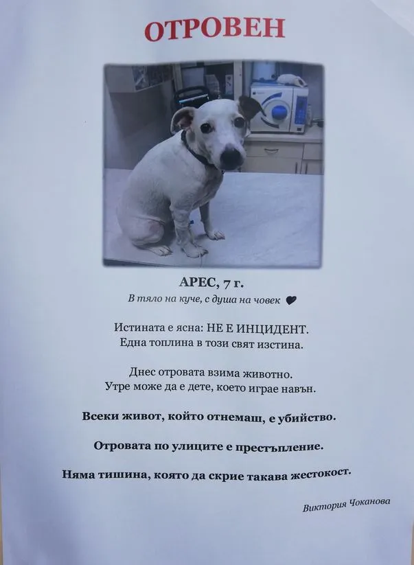 „В тяло на куче, в душа на човек“, описват четириногия си другар неговите стопани. „Днес отровата взима животно. Утре може да е дете, което играе навън“, гласи посланието, отправено от Виктория Чоканова.