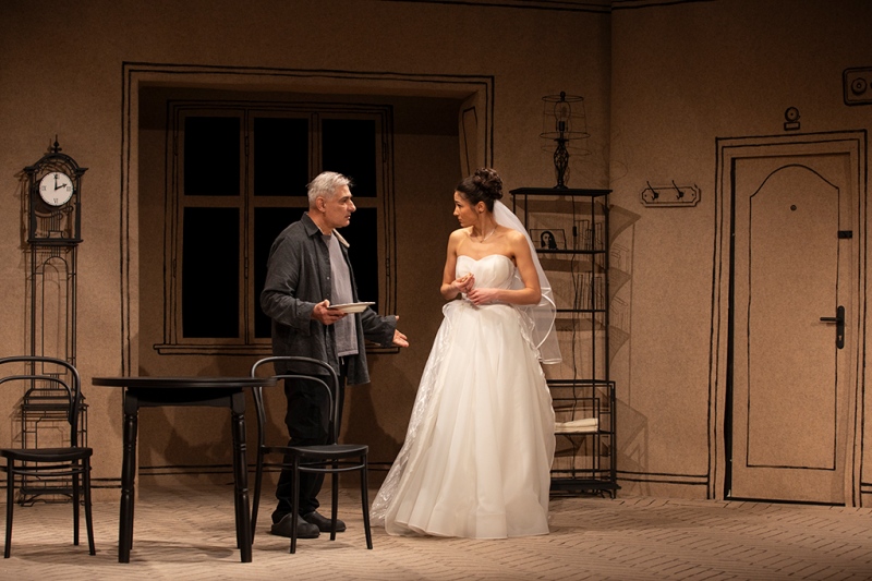 - В него става въпрос за мъж и жена, които искат да направят семейство, обаче момичето е 15 години по-младо и има проблеми с родителите си. Те не харесват избраника й, защото той е бил женен и има дете, но се е развел заради нея… Аз играя драматичен персонаж - един малко депресиран човек, на когото преди 6 години е починала съпругата му. Той страшно я е обичал и си живее със спомена за нея - дори й говори, сякаш тя е до него. Това е самотен и крайно изолиран човек и точно в неговата къща връхлитат въпросните мъж и жена, които имат дилемата дали да се женят, или да не се женят. В действието се намесва и съседката – в ролята Мариана Миланова. В един момент героинята на Керана (булката-б.а.) изпада в отчаяние и безпътица, а ние я окуражаваме и й даваме съвети. Пиесата е оптимистична и се опитва да реши този проблем на двамата млади, за да се стигне до заветното „Горчиво“!