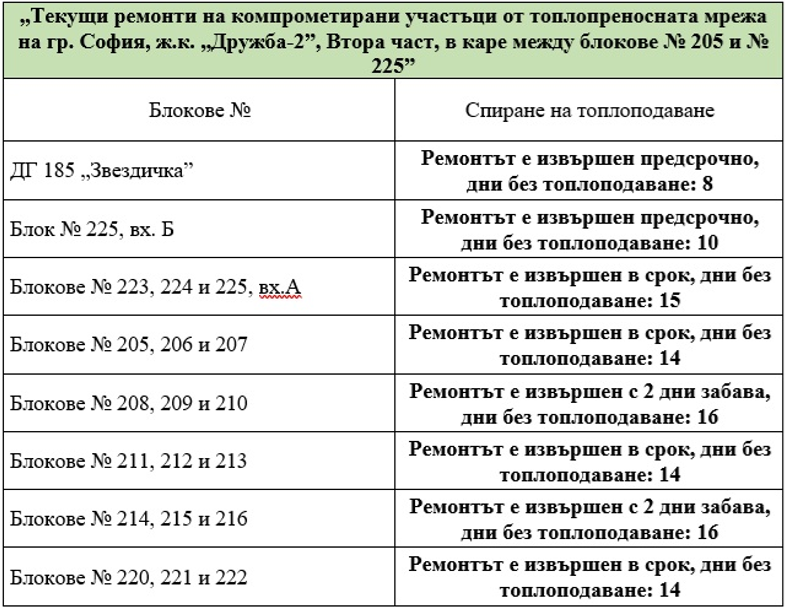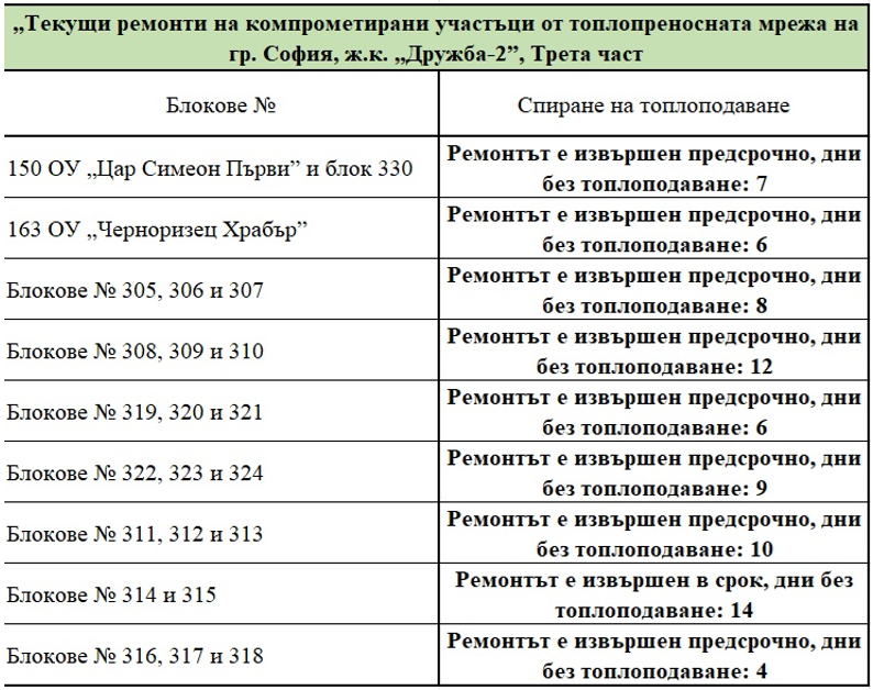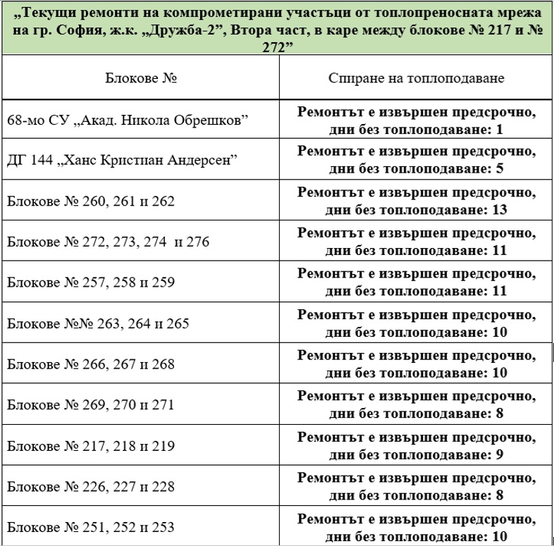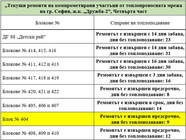 Ремонтът е извършен предсрочно за блок №404. С него се финализират ремонтните дейности и всички обекти в квартала са с подменено трасе и възстановено топлоподаване. Предстои възстановяване на настилките на засегнатите участъци и компенсаторно залесяване на района.