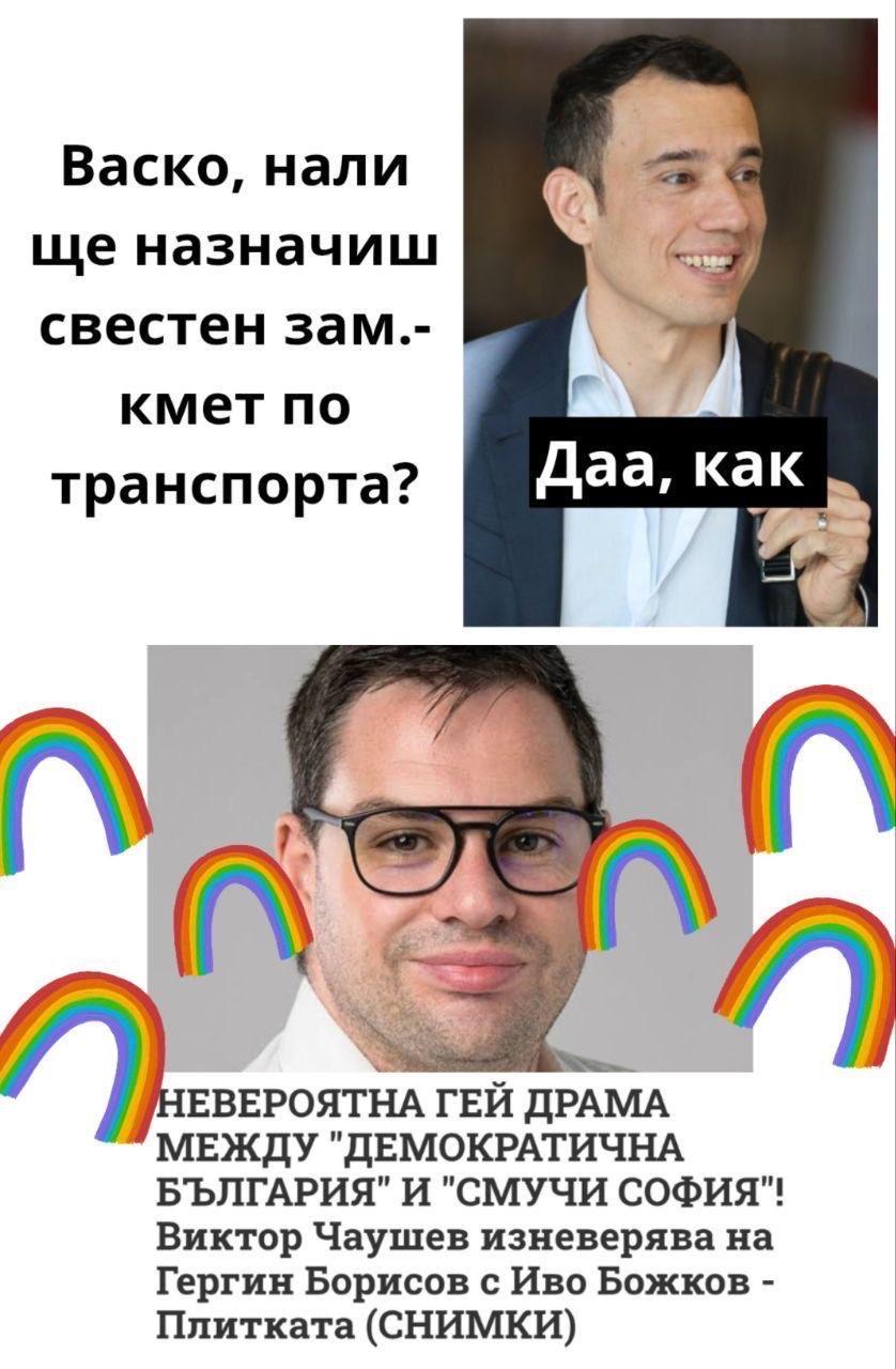 Суингингът при тях датира още от предишните местни избори през 2019 г. Тогава Чаушев, един от петимата основни активисти от „Спаси София“, напусна доскорошните си събратя и мина на другия фронт – като кандидат за общински съветник в конкурентната тогава листа на ДБ. Причината не бе тривиална, а сексуална. Чаушев зарязал интимния си партньор Гергин Борисов (кандидат за общински съветник от „Спаси София“), изневерявайки му с общинския съветник от „Демократична България“ Иво Божков.”, пише ПИК.