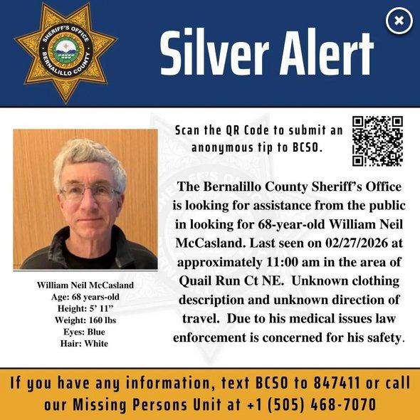 Уилям Маккасланд напуска дома си в Албакърки, щата Ню Мексико, на 27 февруари, след което изчезва безследно. Според информация на местните власти 68-годишният пенсиониран генерал е тръгнал пеша и е оставил мобилния телефон в дома си.