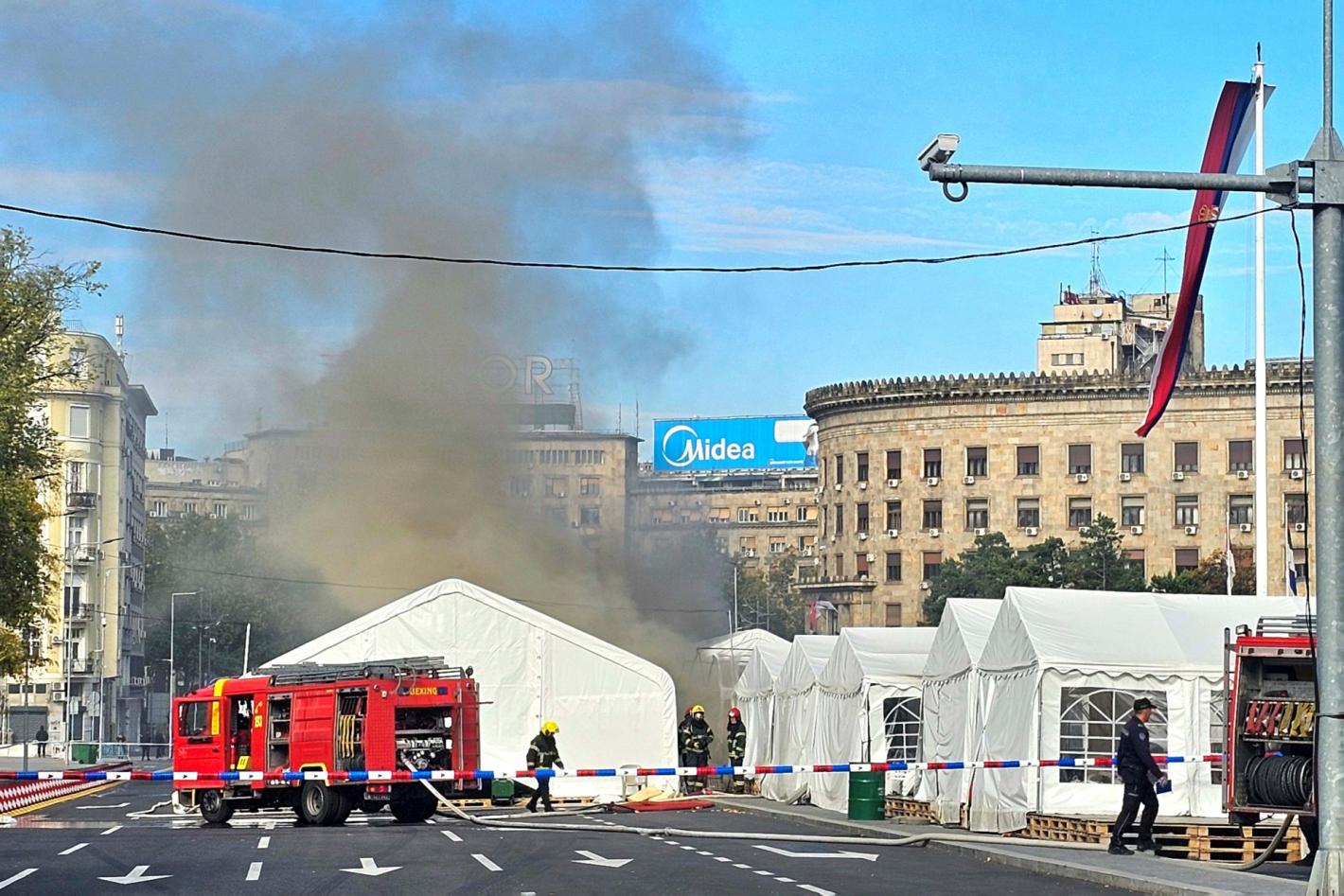 По информация на ТАНЮГ след инцидента е възникнал пожар в една от палатките на площада пред сръбския парламент, като на място са пристигнали четири пожарни коли.