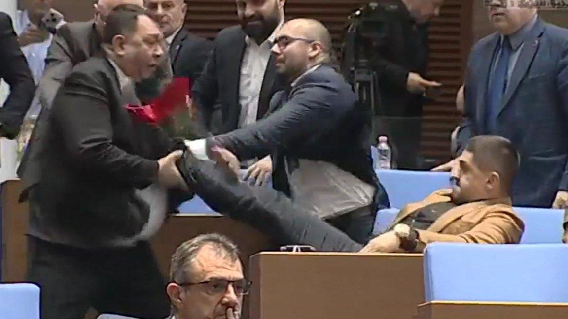 На кадрите се видя, че двамата влязоха първо в словесна престрелка с остри реплики. Депутати от двете групи се опитаха да ги разтърват, но въпреки това Василев първо изрита Далоолу в гърдите, докато седеше на мястото си, а след това стана, посегна и го удари.
